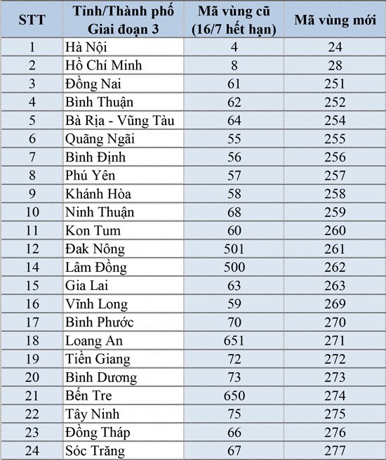 Quý khách hàng có thể theo dõi bảng mã vùng thay đổi như sau: